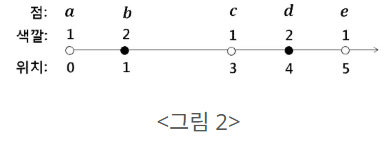 각 점은 N개의 색깔 중 하나를 가진다. 편의상, 색깔은 1부터 N까지의 수로 표시한다. 각 점 p에 대해서, p에서 시작하는 직선 화살표를 이용해서 다른 점 q에 연결하려고 한다. 여기서, 점 q는 p와 같은 색깔의 점들 중 p와 거리가 가장 가까운 점이어야 한다. 만약 가장 가까운 점이 두 개 이상이면 아무거나 하나를 선택한다. 모든 점에 대해서 같은 색깔을 가진 다른 점이 항상 존재한다. 따라서 각 점 p에서 시작하여 위 조건을 만족하는 q로 가는 하나의 화살표를 항상 그릴 수 있다. 예를 들어, 점들을 순서쌍 (위치, 색깔) 로 표시할 때, a = (0,1), b = (1, 2), c = (3, 1), d = (4, 2), e = (5, 1)라고 하자. 아래 <그림 2>에서 이 점들을 표시한다. 여기서 흰색은 1, 검은색은 2에 해당된다.