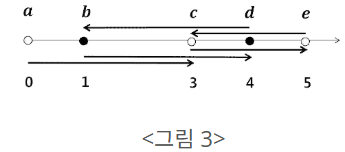 위의 조건으로 화살표를 그리면, 아래 <그림 3>과 같이 점 a의 화살표는 c로 연결된다. 점 b와 d의 화살표는 각각 d와 b로 연결된다. 또한 점 c와 e의 화살표는 각각 e와 c로 연결된다. 따라서 모든 화살표들의 길이 합은 3 + 3 + 2 + 3 + 2 = 13이다.