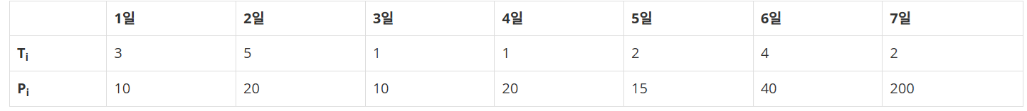각각의 상담은 상담을 완료하는데 걸리는 기간 Ti와 상담을 했을 때 받을 수 있는 금액 Pi로 이루어져 있다. N = 7인 경우에 다음과 같은 상담 일정표를 보자.